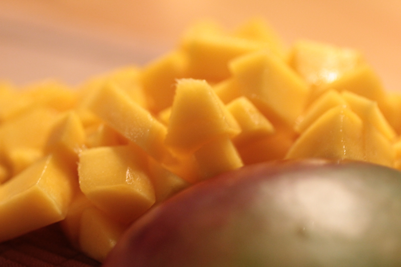 Das Mangofruchtfleisch in Würfel schneiden. | ||||||||