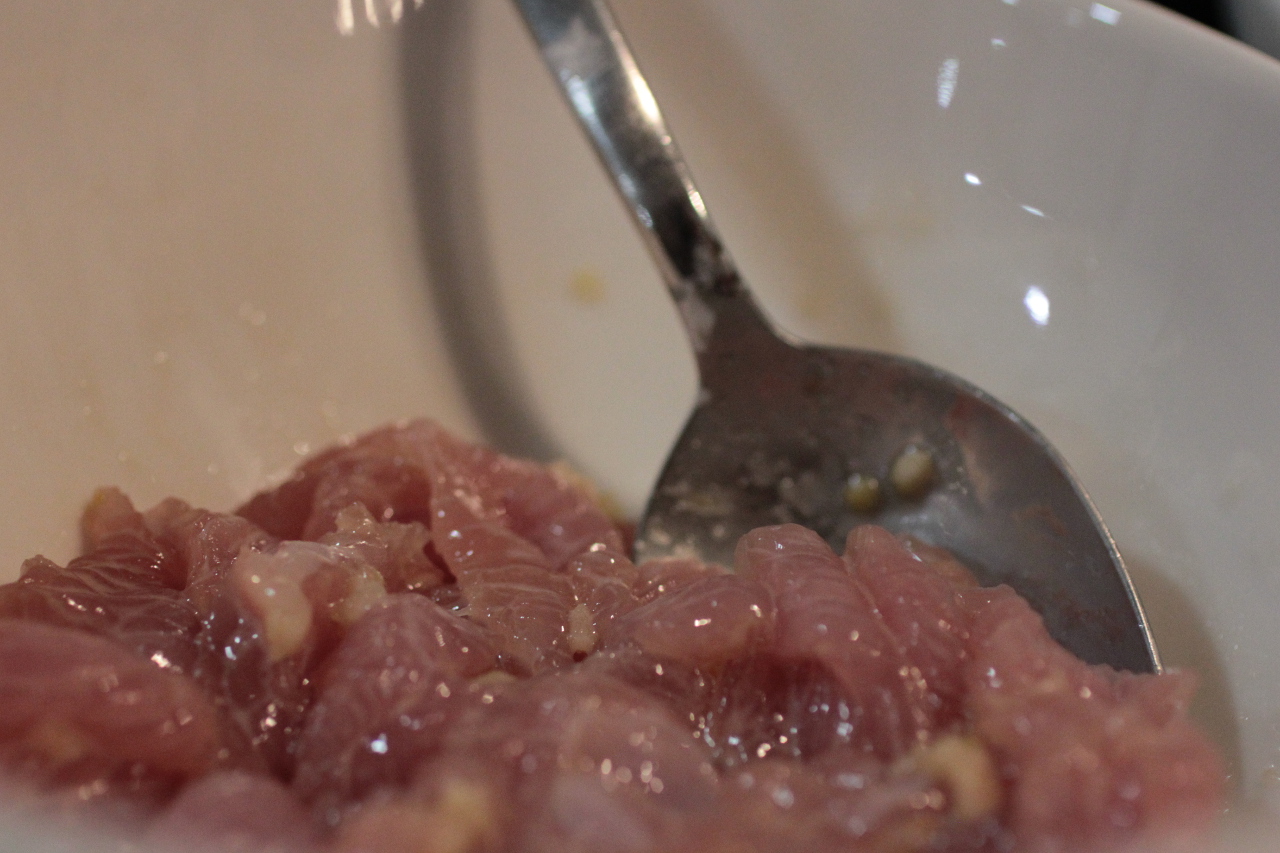 Den Knoblauch schälen und hacken. Zusammen mit Zucker, Stärke und Fischsauce zu einer Marinade vermischen. Diese unter das Fleisch rühren und ca. eine halbe Stunde marinieren. | ||||||||